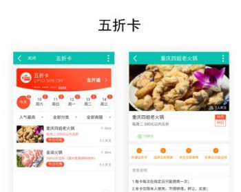 1.五折卡 ,显示每天打折的商家活动,用户可选择时间去消费 ,用户可以在线购买五折卡,也可以用H码激活或者通过免费领活动领取体验.