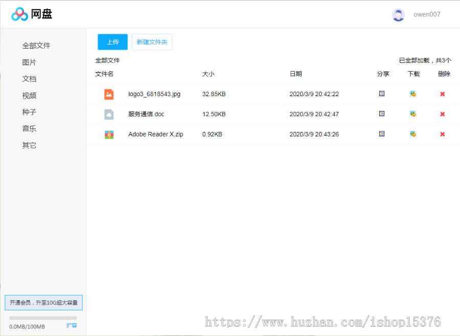 1、程序介绍:创建文件夹,上传文件,可进行删除,下载,分享等功能,异步上传。