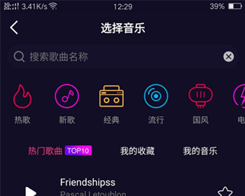 4.自定义音乐:在录制短视频内容前,可添加自定义音乐内容,支持接入原创音乐