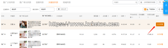 三、优化关键词。一次出价不可能永远都不修改,经过上面的找词加词出价,7天后就要看直通车报表数据作分析了。这也是提升排名,获取流量的关键操作。我们通过直通车关键词报表来查看分日详情。点击分日详情,我们还可以看到一个词更加细化的数据。