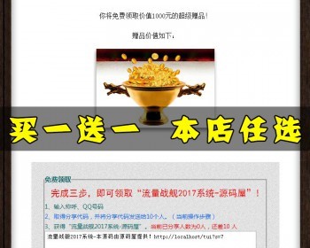 我们把2017流量战舰程序安装在一个精美的引导页(推广页)上,这个页面呢我们展示一个比较珍贵,好多人很想得到的一样东西。我们把这样的珍贵东西作为赠品,免费送人,访客免费领取的条件就是把这个页面告诉身边几个人而已访客是无需注册的,只需填写QQ号码就能获取推广链接,开始推广,领取自己想要的资料,所以参与性很高!而且这种流量是几何式的、源源不断的!引导页的先要位置呢,放置我们要推广的产品图片或者广告语和链接。如果这个页面,如果你想免费得到这套自动引流程序只需要按照如下方法……