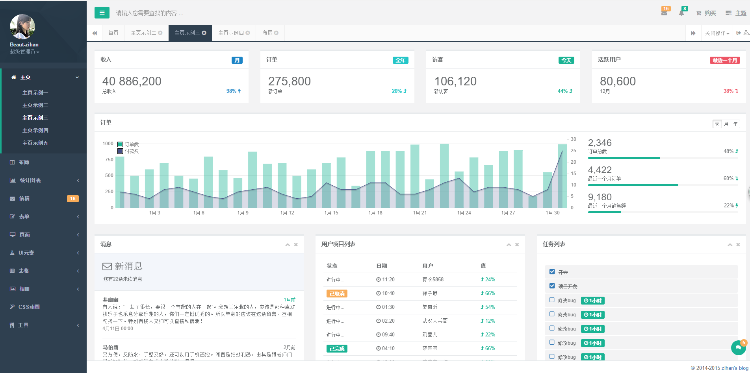 H+是一个完全响应式,基于Bootstrap3.3.6本开发的扁平化主题,她采用了主流的左右两栏式布局,使用了Html5+CSS3等现代技术,她提供了诸多的强大的可以重新组合的UI组件,并集成了的jQuery版本(v2.1.4),当然,也集成了很多功能强大,用途广泛的jQuery插件,她可以用于所有的Web应用程序,如网站管理后台,网站会员中心,CMS,CRM,OA等等,当然,您也可以对她进行深度定制,以做出更强系统。