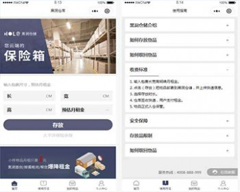 手机微信在线仓库租赁下单,保险箱仓库管理小程序网页模板。包含:仓库主页、使用方法、我的物品、个人中心、查看详情、修改寄件信息、地址、我的余额、实名认证、意见反馈等等模块页面。