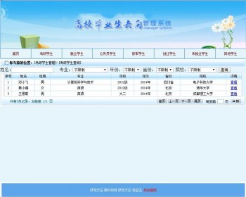 就业生基本信息管理模块为管理员提供就业生信息查询,修改和删除等基本功能。按专业,按年份,按地区,按就业单位等查询就业生基本信息或做其他操作,并显示相应查询数据。(姓名 性别 专业 年级 年份 地区 就业单位)