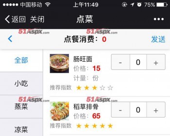 5、 服务员点餐流程:点击点餐按钮,选择餐桌号,进入菜品列表(可根据不同的分类选择同一类菜品),选择菜品,选数量。点击发送完成点餐;