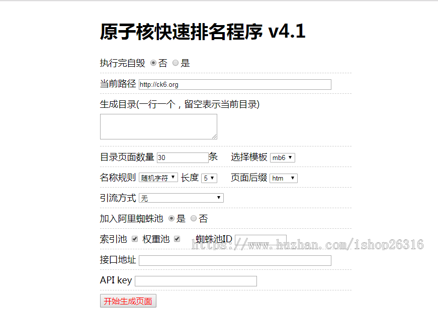 例:http://www.baidu.com/mulu,后不要带斜线生成目录:可以多个目录生成,留空生成在当前目录下选择模板:选择模板文件目录页面数量:设置单个目录下的生成数量,不是总数引流方式:无,不做任何跳转JS跳转,通过调用外部js文件,进行直接跳转,地址栏网址会变化框架,通过框架结构进行引流,当用户访问显示引流的站点页面内容,不是跳转,所以地址栏网址不会变化JS跳转(区分蜘蛛和用户),通过调用外部JS文件,实现区分蜘蛛和用户访问,如果是用户访问,进行跳转,地址栏网址会变化页面后缀:选择生成文件的后缀名加入蜘蛛池:将生成的页面直接加入蜘蛛池,可选索引池和权重池,无需手动操作,建议加入,配合效果更快更明显索引池、权重池:选择要加入的位置,权重池自动获取页面关键词进行加入接口地址:填写蜘蛛池的api地址,请查看蜘蛛池后台,“全部”菜单,“接口“里边的“API接口”页面APIkey:填写蜘蛛池的apikey,请查看蜘蛛池后台,“全部”菜单,“接口“里边的“API接口”页面蜘蛛池ID:填写要加入的蜘蛛池里边,请查看key目录文件说明:(单个txt文件请不要超过1M)juzi1.txt 放置句子,一行一条...juzi9.txtguanjianci1.txt 放置关键词,一行一条...guanjianci9.txtduanzi1.txt 放置段子,用来组合文章内容,一行一段...duanzi9.txtmb1.txt