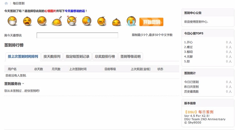 本插件将在前台添加一个签到面板,在这里你可以进行签到操作,以及查看签到排行榜,还可以使用签到自动回帖功能。