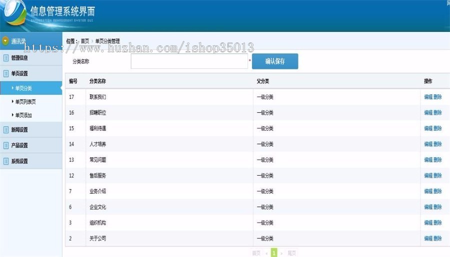 3、单页设置:单页分类、单页列表页、单页添加