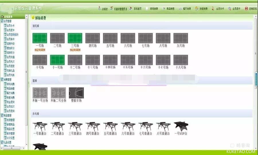 消费管理:球场消费 商品销售 餐厅消费 快速消费 现金退货 会员扣次 会员退货