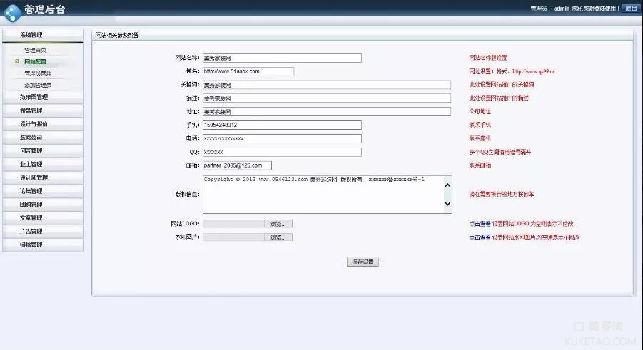 1、系统管理:管理首页、网站配置、管理员管理、添加管理员。