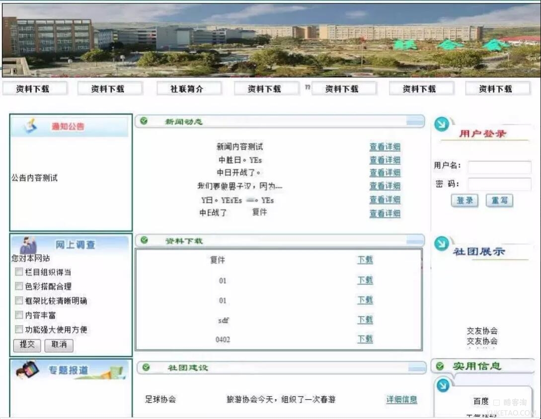 8、通知公告;网上调查、用户登录;社团展示;使用信息;专题报道;活动图片展示等功能