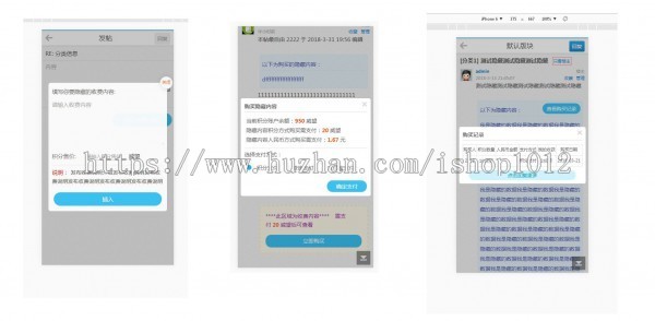 插件功能介绍:1.支持积分支付查看隐藏内容;2.支持在线人民币支付查看隐藏内容;注意:在线人民币支付需安装 插件,不然只能使用积分支付购买隐藏内容;3.支持电脑版与手机版发布插入隐藏内容;4.支持单独设置启用板块、设置发布用户组、设置无需购买查看用户组;5.支持单独设置开启支付方式;6.支持设置发布者收益比例;