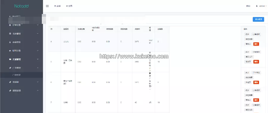用户列表:对用户进行相册、财务、封号、禁用、赠送金币、推送、推广绑定的操作
