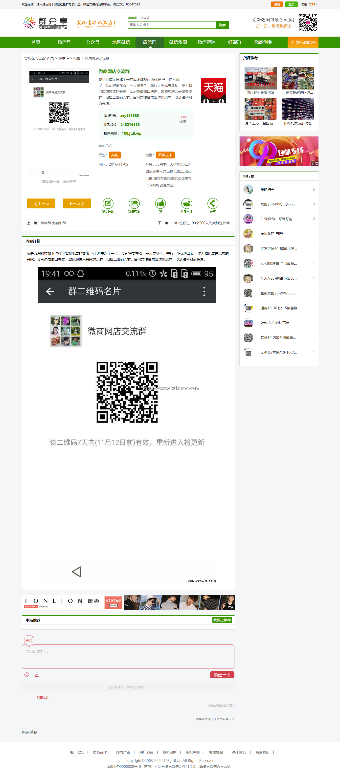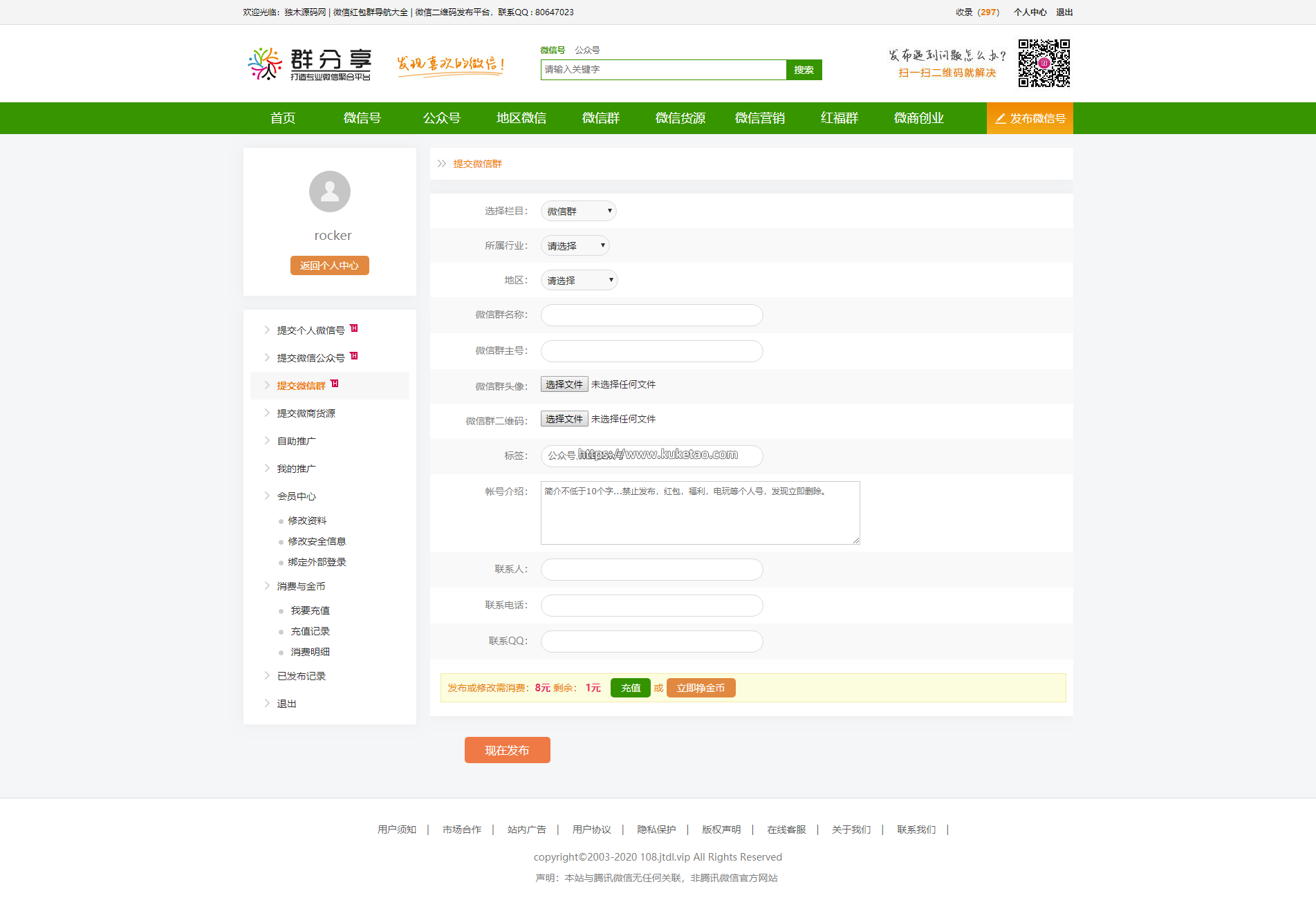 帝国CMS整站源码《微信群推广》,本套模板源码美观大气,全站实现伪静态包括手机端伪静态,维护更方便;系统集成了支付宝免签接口、聚合页、多端访问以及付费推广系统等等。整套模板经过SEO优化,非常利于百度等搜索引擎收录,是一套非常好的商业源码。模板已经经过本站测试及修复,并且修复了地区频道页调用淘宝IP地址库502的严重错误,现在入手直接可以用,直接运营,直接开始赚钱。只要稍微熟悉一下帝国CMS系统,您马上就可以运营了。