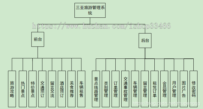 本系统主要包括前台和后台两大模块,前台实现了旅游攻略景点分类、热门景点、特价景点、交通预订、酒店预订、美食推荐、车辆租售、留言交流等功能模块,后台实现了旅游攻略、类别管理、景点线路管理、订单管理、交通事故管理、酒店管理、美食推荐、车辆管理、租凭订单、留言管理、会员管理、用户管理、图片广告、密码修改等功能模块。其结构功能图如下图所示: