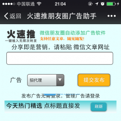 火速推微信朋友圈广告植入源码,朋友圈广告自己来发布,支持任意微信文章,转发之后自动在朋友圈文章中植入广告,别人打开文章会看到你的广告,带广告的文章会被别人无限次帮你转发,获得超强宣传效果。转发文章到朋友圈自己添加广告,这种广告形式比直接发朋友圈硬广更有效,创新才有未来!