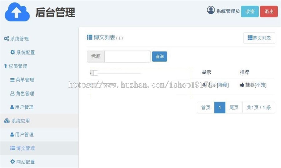 博文管理:用于管理用户发布的博文信息,可设置博文的属性(包括是否前台显示、是否为推荐);