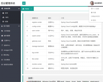 管理后台界面有html、jquery,样式有layui和bootstrap,可作为微服务的脚手架项目。
