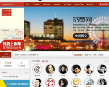 微信公众号导航源码,仿扔 赞网,微信公众账号推广平台。扔 赞网微信公众号导航界面和功能都很不错的,其内核为鱼福cms,整套系统伪静态,有利于搜索引擎收录,用于微信公众账号推广平台非常不错。完美亲测无误