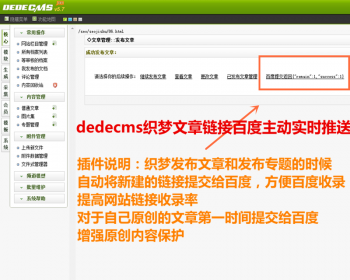 【插件说明:这个工具是根据百度站长平台提供的PHPpost提交链接的代码整合到DEDECMS后台发布文章和发布专题的时候 自动将新建的链接提交给百度,方便百度收录我们的链接,提高网站链接收录率,对于自己原创的文章时间提交给百度 ,强原创保护。是织梦网站必备插件!】