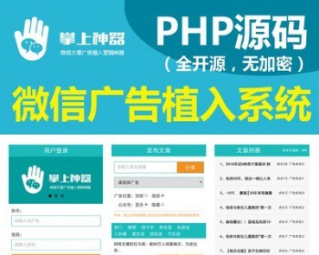 源码自提网址:http://tiqu.pilicat.com/25954875 —————————————————————————————————————— 掌上推广(微信朋友圈广告植入系统) 2016-06-24 更新: 修复采集文章乱码问题—————————————————————————————————————— 把升级包里的文件上传覆盖原来的就可以,覆盖之前先备份原来的。然后对照文件修改里面的内容。 2016-06-20 更新: 1,更换原来不完善的编辑器,更换为更加完善的百度编辑器。(edit_article.php、edit_article2.php)2,增加分享文章时公众号信息编辑框。(edit_article.php、edit_article2.php)3,增加用户自行发布文章页面(add_article.php)4,增加会员购买页面,便于更好服务用户(hygm.php)5,发布文章页增加更多的文章分类,让用户有更多文章直接分享。(edit.php)6,优化广告添加页面内容。(ad_edit.php)7,优化点击“立即分享”文章daili字段没有值得问题。(cjsave.php)8,优化原.sql数据库备份文件因版本过高,导致部分用户导入失败问题。(zbaipinyiku.sql)9,文章列表增加提示。(list.php) ——————————————————————————————————————2016-04-28 更新: 1,增加文章编辑功能。 (初版编辑功能,建议电脑编辑好以后再用手机分享,因为有的手机浏览器兼容性问题) 如果不喜欢这个编辑功能,可以使用原版cjsave.php、原版edit.php替换掉cjsave.php和edit.php文件。2,增加【联系客服 kefu.php】【使用教程 syjc.php】【会员代理 hydl.php】三个页面。3,修复时间限制无效的问题 。 4,修复文章列表删除文章后,所剩条数增加问题 。 5,文章页广告添加关闭功能(符合新广告法要求)。6,修复分享文章时选择公众号隐藏无效问题。7,修复后台会员已发文章显示不全问题。8,修复后台顶部logo点击链接问题。 2016-04-10 更新:1,前台文章列表页添加删除功能2,发布文章页增加更多按钮3,后台admin增加总用户列表、总文章列表。可以查看所有用户和所有文章。 2016-04-06 更新: 修正微信屏蔽外部链接调用问题 2016-03-26 总结最近安装出现问题: 1,安装本程序服务器需要支持PHP,安装MYSQL数据库,也就是PHP+MYSQL配置。 PHP5.1以上。 1.1 导入10.sql到你自己新建的数据库 2,下面安装的步,使用编辑软件打开include/common.inc.php 修改文件中的数据库帐号密码。 define('DB_HOST','localhost');//数据库连接地址,数据库接口(默认:3306)define('DB_USER','改成你自己的');//数据库用户名改 define('DB_PWD','改成你自己的');//数据库密码define('DB_NAME','改成你自己的');//数据库名 你会找到这样的几行,注意,这里是把你的资料,替换掉中间的root部分,而不是中文部分。另外注意后面的注释,不要填颠倒了。条不用改。除非你的数据库和你的程序不在一个服务器上。 3,需要修改会员自助注册使用文章条数,试用时间等 请修改register.php文件 第168行 <input name="anums" type="hidden" class=>