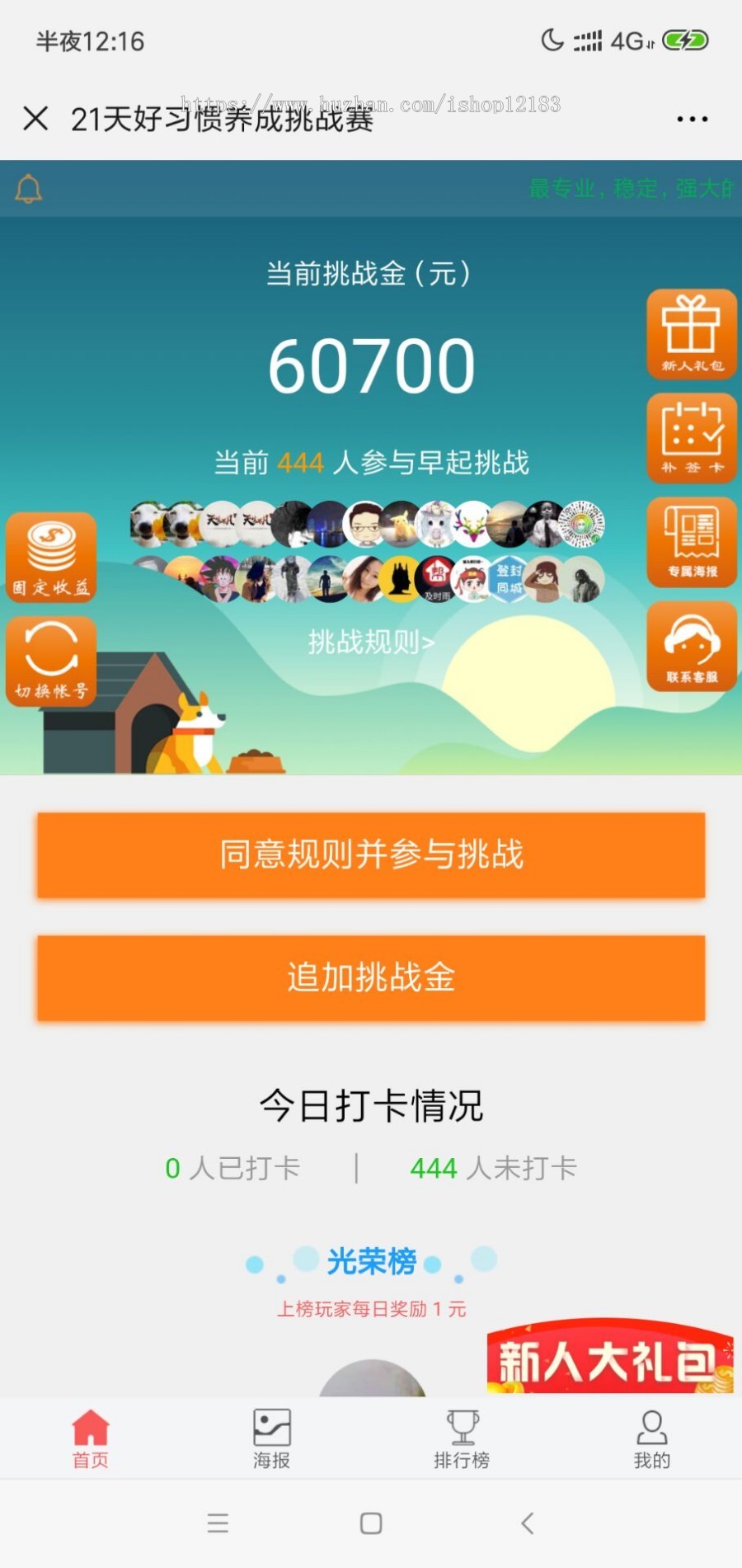 参加者打卡挑战者支付挑战金,连续打卡签到21天可退还挑战金,打卡挑战者按照1元每份额每天瓜分未打卡挑战者挑战金,支付挑战金越高,瓜分奖励金也就越高。