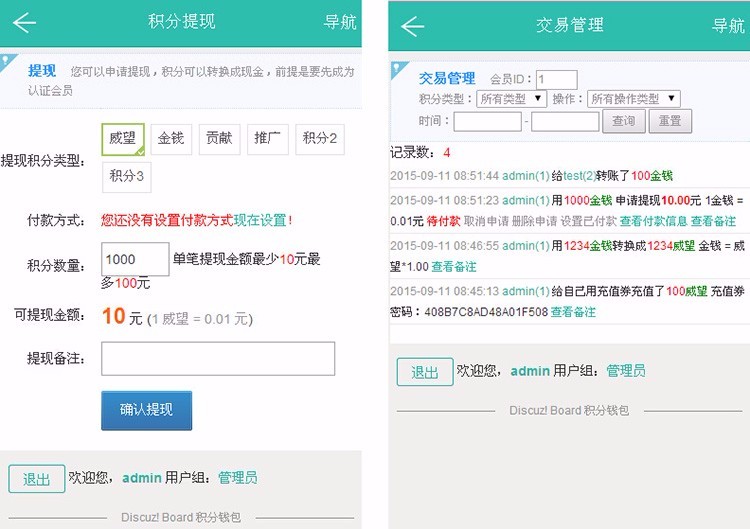 1、充值:可以用充值券或在线现金支付充值,充值券可以在网站后台生成2、转换:实现自定义源积分类型和目标积分类型单向转换3、转账:可以给论坛的别的好友会员转积分4、提现:可以用积分申请现金提现以上操作都支持论坛的8个积分类型,和论坛积分同步的,与所有同步论坛积分的插件都可以配合用,都有是否开启功能,都可以设置用户组权限