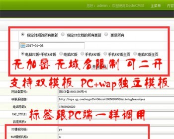 说明:插件无需切换、无加密文件、无时间限制、无绑定域名限制,文件完全开源版,PC和WAP全部都是一键更新。网站页面自动识别跳转PC端和手机端。