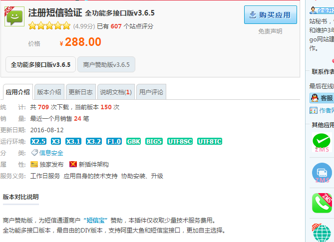 其他说明:这个插件我自己在用,经过了严格测试以及修复了一些小问题,拿来运营一切OK,功能非常的全面,内置了阿里大于的接口以及例外的一家,我个人用的阿里大于,其他看下面的插件说明!
