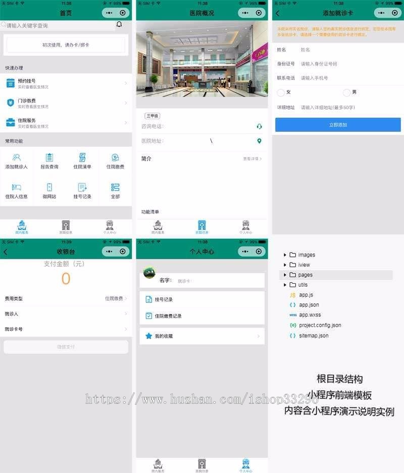 绿色的医院住院办理,门诊预约挂号微信小程序页面模板。包含:办卡绑定、快速办理预约挂号、门诊缴费、住院服务、医院信息、个人中心、添加就诊人、找医生等等。
