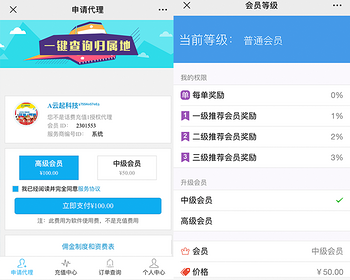申请代理:自定义图、会员信息、升级选择、会员特权佣金制度资费表