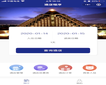 基于PHP开发的一款简洁大气的酒店客房预订小程序,含小程序前端和后端源码,支持酒店预定、酒店详情、地图定位、在线支付、优惠券、会员卡等功能,适合酒店、宾馆拿来搭建自己的小程序酒店服务平台!