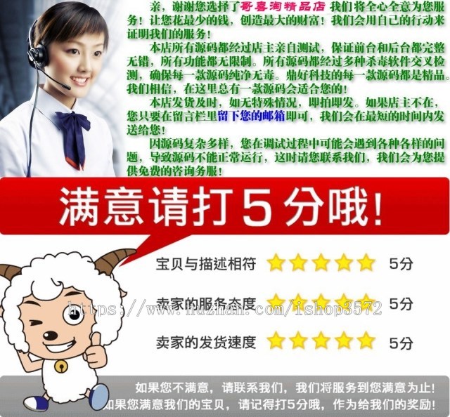 默认价格拍下只是源码的价格,不包括任何安装、修改服务,如需要修改和定制功能,请联系掌柜,5分好评之后可享受以下服务:加做网站LOGO,【如需要,可以提供VPS不限制大小空间和数据库,直接帮安装好,不定期维护数据备份等,空间价格一般在150元/年 】