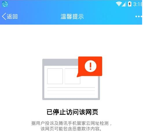2、并且我们还有一个牛逼的功能,当用手机QQ点击别人发布的网址时,会出现内容被拦截的情况,如果您的网站在手机QQ里面有出现这个情况,那么很抱歉,已经限制了您网站的内容并且成功拦截,
