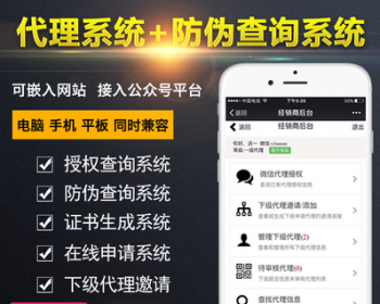 系统功能:PC+移动端+微信端均可查询、代理编号生成、自定义代码编号、代理导入修改删除、防伪证书生成、代理等级自定义、防伪查询功能、等等...