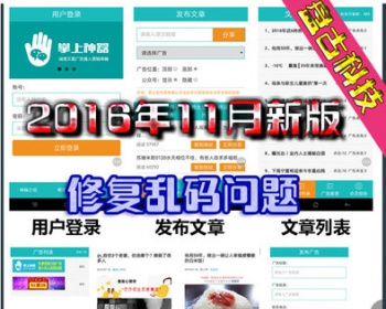 6.25 修复乱码问题1.更换原来不完善的编辑器,更换为更加完善的百度编辑器。(edit_article.php、edit_article2.php)2.增加分享文章时修改公众号信息编辑框。(edit_article.php、edit_article2.php)3.增加用户自行发布文章页面(add_article.php)4.增加会员购买页面,便于更好服务用户(hygm.php)5.发布文章页增加更多的文章分类,让用户有更多文章直接分享。(edit.php)6.优化广告添加页面内容。(ad_edit.php)7.优化点击“立即分享”文章daili字段没有值得问题。(cjsave.php)8.优化原.sql数据库备份文件因版本过高,导致部分用户导入失败问题。(zbaipinyiku.sql)9.文章列表增加提示。(list.php)四月份更新如下:1.增加文章编辑功能。 (初版编辑功能,建议电脑编辑好以后再用手机分享,因为有的手机浏览器兼容性问题) 如果不喜欢这个编辑功能,可以使用原版cjsave.php、原版edit.php替换掉cjsave.php和edit.php文件。2.增加【联系客服 kefu.php】【使用教程 syjc.php】【会员代理 hydl.php】三个页面。3.修复时间限制无效的问题 。 4.修复文章列表删除文章后,所剩条数增加问题 。 5.文章页广告添加关闭功能(符合新广告法要求)。6.修复分享文章时选择公众号隐藏无效问题。7.修复后台会员已发文章显示不全问题。8.修复后台顶部logo点击链接问题。9.前台文章列表页添加删除功能10.发布文章页增加更多按钮11.后台admin增加总用户列表、总文章列表。可以查看所有用户和所有文章。12.修复图片显示问题。